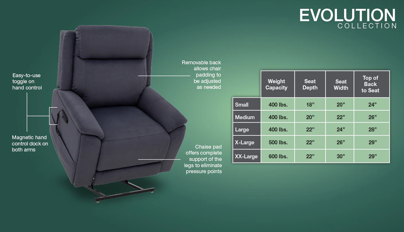 While Pride Mobility began exclusively as a lift chair manufacturer in 1986, our company has never stopped innovating, which makes the “Evolution” Collection a fitting name. This collection fits loungers of all kinds, with sizes ranging from small to XXL. The small, medium, and large sizes feature a cup holder and storage compartment in the pull-out arms, with USB-A and USB-C chargers in the storage area to keep you connected. These sizes also offer an enhanced three-position experience, which provides you with additional resting positions. The XL and XXL sizes are proudly made in the U.S.A. of foreign and domestic parts and feature a USB charger in the hand control. These chairs also come standard with a convenient lithium battery backup. With the Evolution Collection, you’ll be “Sitting Pretty” and experiencing at-home comfort like never before.